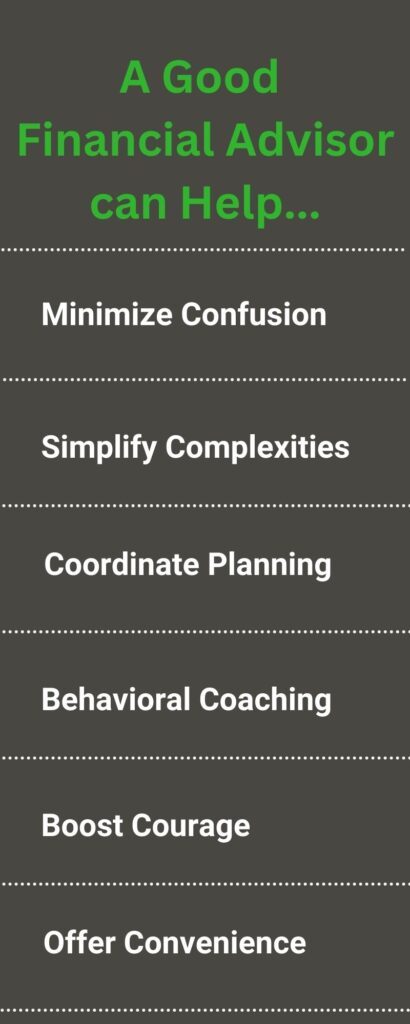Despite the above points, it’s accurate that index funds, target-date funds, and investing apps have made investment management pretty easy for most investors. Where financial advisors can really add a lot of value is by coordinating intertwined financial matters, such as improving tax efficiency with IRAs, 401(k)s, 529 plans, and myriad other strategies; insurance reviews, estate and charitable planning, and more. Often, multiple experts are needed to design a financial future, including accountants, insurance brokers, and trust attorneys. A good financial advisor can help coordinate the whole team and facilitate these vital tasks.